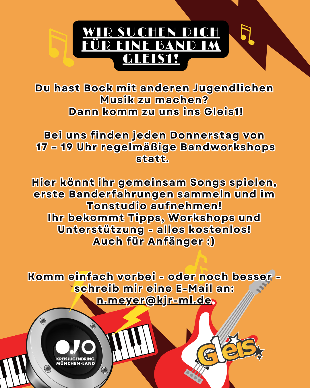 Du hast nur Musik im Kopf? Du spielst ein Instrument oder singst gerne? Dann ist der Bandworkshop im Gleis 1 genau das richtige für dich. Jeden Donnerstag von 17 bis 19 Uhr treffen sich die talentierten Musiker*innen in Begleitung von Nico und machen zusammen Musik. So ist zum Beispiel auch die Melodie entstanden, die ihr in dem Reel hören könnt. 🎤🎼🎸🤘